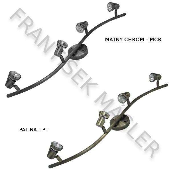 Svítidlo kovové – tyč ohýbaná S4; napájení 230V, 50Hz; žárovka GU10 – max.4x50W; stupeň krytí-IP20; výrobek označen značkou shody s normami EU; záruka 24 měsíců.